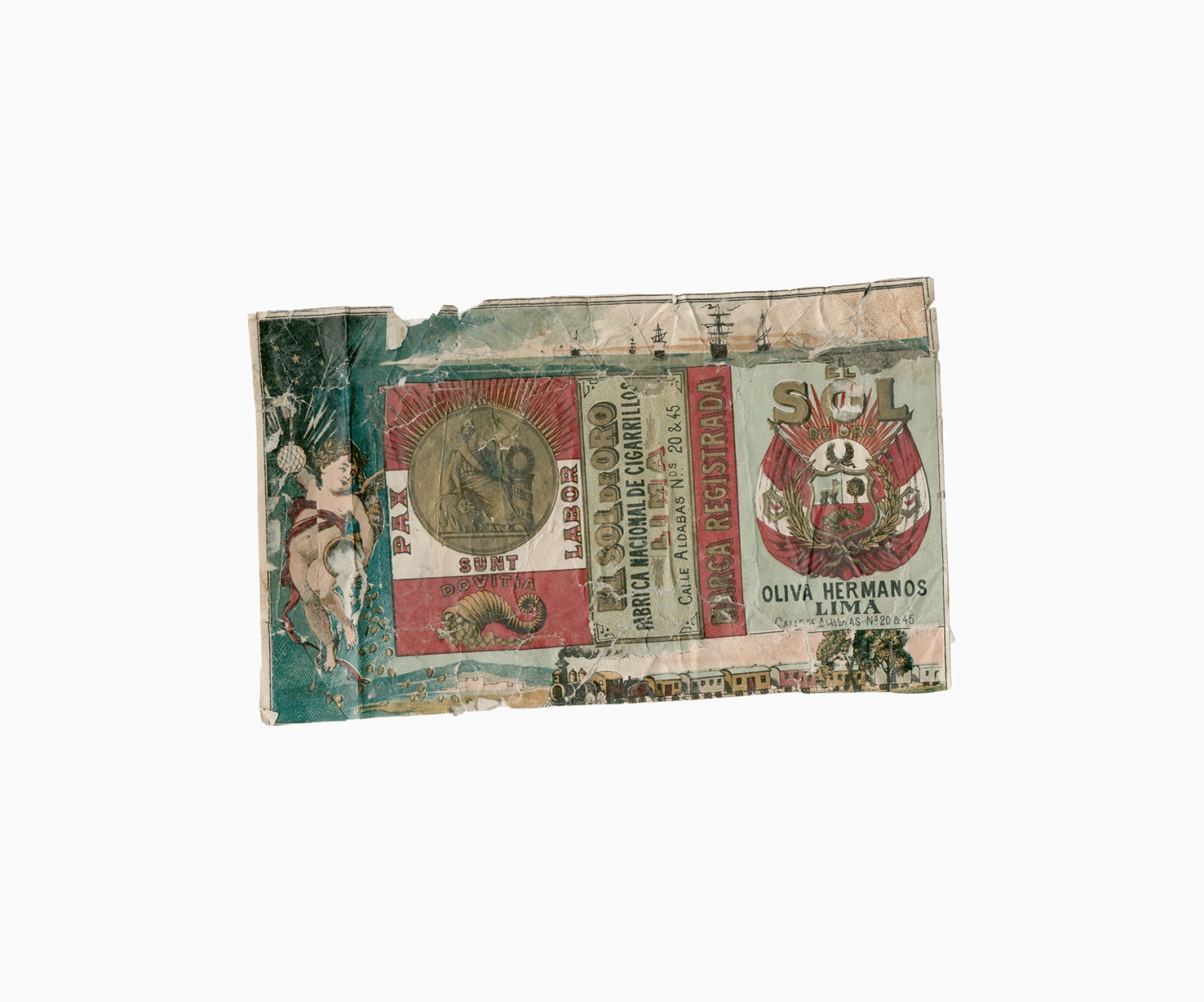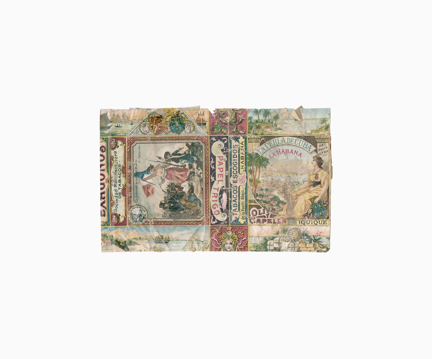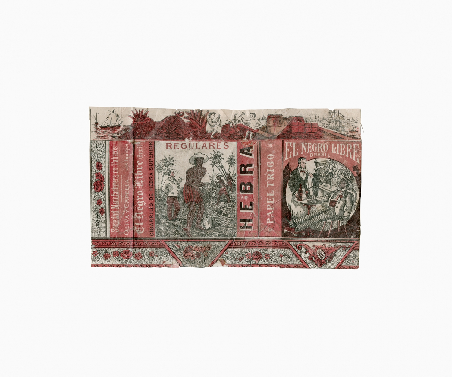 Smoking tobacco was an important part of the social and working life of the nitrate worker. Like chewing coca leaves, smoking tobacco helped to endure the harsh working and living conditions in the Atacama Desert. Smoking and tobacco are recurrent subjects in oral histories, diaries and literary accounts of life in the desert. The following images are examples from a large collection of over six hundred used tobacco wrappers dating from the 'British nitrate era' (1870s to 1920s) that have been dug out from the rubbish dumps of abandoned nitrate towns in the Atacama Desert by Gjorgji Gjuranovic, an amateur historian and archaeologist from Iquique. This personal collection is an archive of the desert. Laid out in a grid, these few hundred tobacco wrappers configure a historical tapestry of the material life of the nitrate worker, preserved for more than a hundred years in the driest desert on Earth.