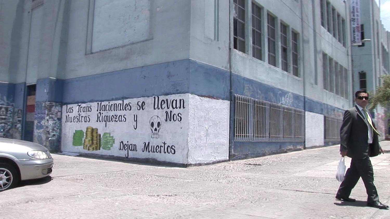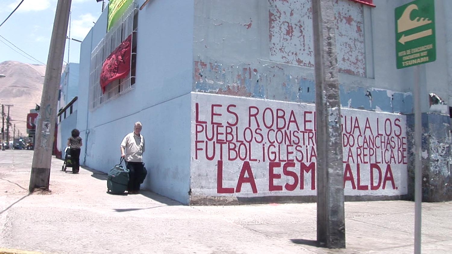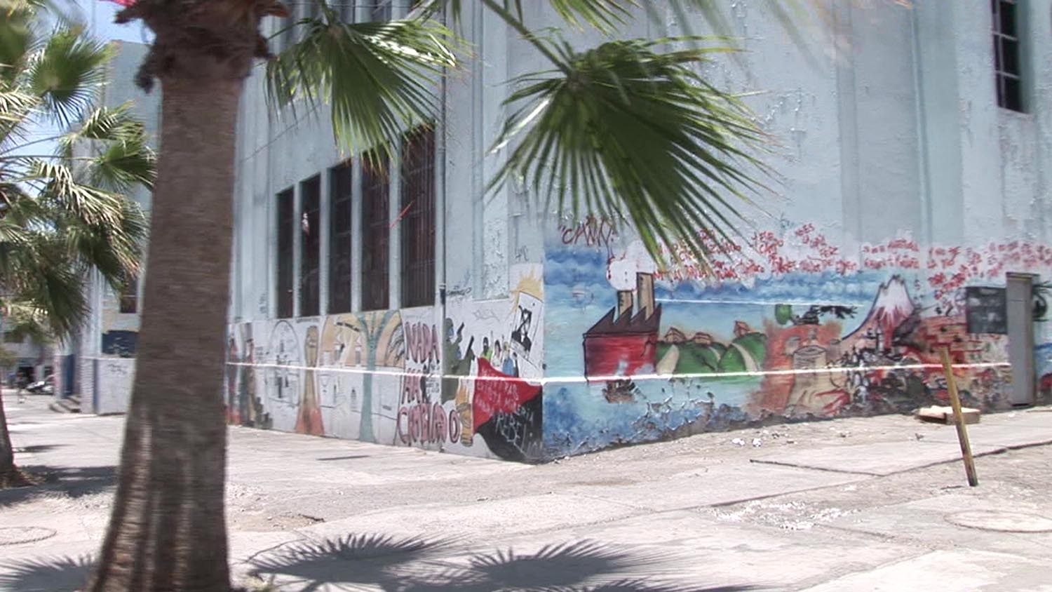The double video projection records the life on the streets around the site where the event took place over a hundred years ago. The original school burned down in the 1930s, but was replaced by a new concrete building, which at the time of filming in December 2010 was due for demolition in the following weeks. For decades, the abandoned school building had been a site of memory for the labour movement and the Chilean left. Workers and students demonstrated and held meetings there, and even occupied the school on many occasions. The graffiti written on the external walls of the building and the banners left there from demonstrations bore witness to the enormous political significance of this site. In the week just previous to our filming the building had been taken over by copper workers from the mine of Chuquicamata, some 200 km away from Iquique. The video registers the everyday life on both sides of the street around the school, days before its demolition, recording at the same time the last political graffiti written on its external walls. The double images are a record of a site of memory about to disappear.