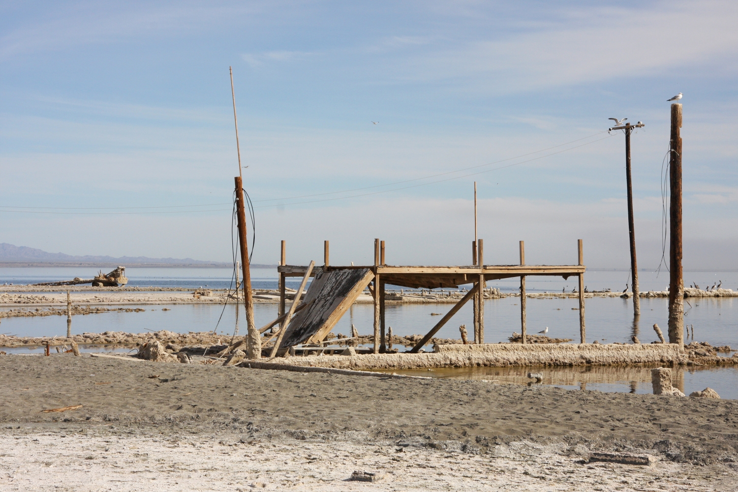 Between 1958 and 1964 a 400-kilometre road network was constructed in the desert, along with 500 kilometres of water pipes and electricity lines for 32,000 plots, all of which were sold during this period. To this basic infrastructure were added golf courses, marinas, luxury restaurants, race courses for high-powered speedboats, waterskiing facilities, and runways for private aeroplanes. Guests of the exclusive clubs on the Salton Sea included President Eisenhower, Frank Sinatra, the Beach Boys and Hollywood-Stars such as Johnny Weissmuller, Jerry Lewis and the Marx Brothers. In the 1960s Salton City was also declared a Mecca for fishing: fish released into the sea had proliferated to such an extent that the Salton Sea now came to be regarded as one of the world’s most productive bodies of water. However, fish thrive here because they have so much algae to eat, algae that proliferate because the abundance of nutrients in the water. These nutrients originate from industrial agricultural land irrigated by the Colorado River and drained into the Salton Sea. The problem is that the sea has neither a natural inflow nor a natural outflow, and the water collecting in it is only reduced through evaporation. As a result, the water’s nutrient and mineral content increases constantly. For instance, over recent decades the salt content of the sea has increased to such a degree that today it is well above that of sea water. In order to prevent the sea from dying, several million tons of salt will have to be removed every year. Proliferating algae blooms and increased concentrations of bacteria have already led to repeated mass deaths of local bird populations in the wetlands, and every year large quantities of dead fish are washed up on the shoreline.