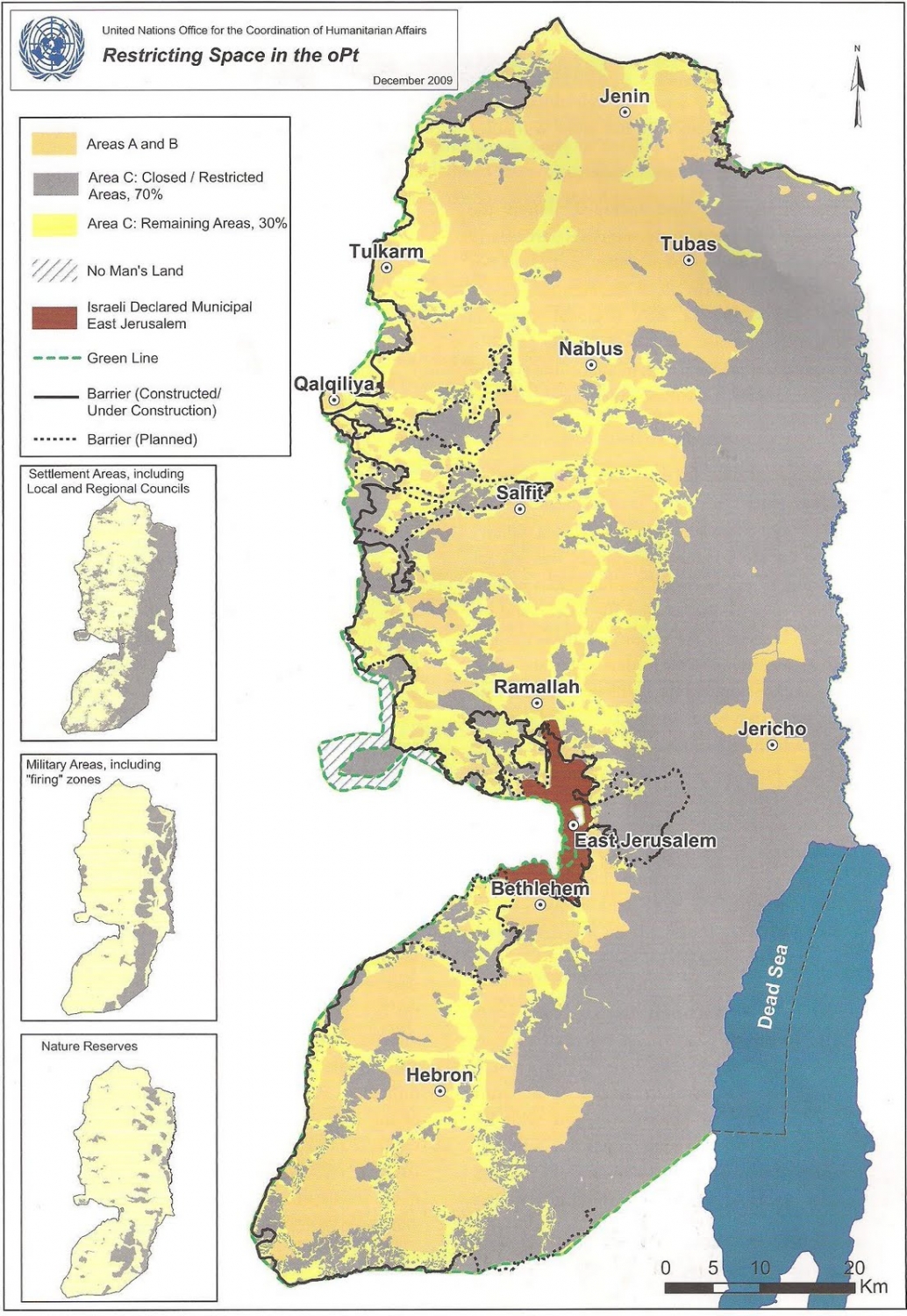 The West Bank is currently divided in terms of administration and security. There are three areas known as Area A, Area B and Area C, and these different ‘Zones’ have a different impact on Palestinians depending on the degree to which their lives are oppressed and regulated and the extent to which they are able to engage with and use space in the OPT (see figure A). The measurements given below are an approximation as the West Bank is constantly changing as Israel moves towards establishing greater control.
